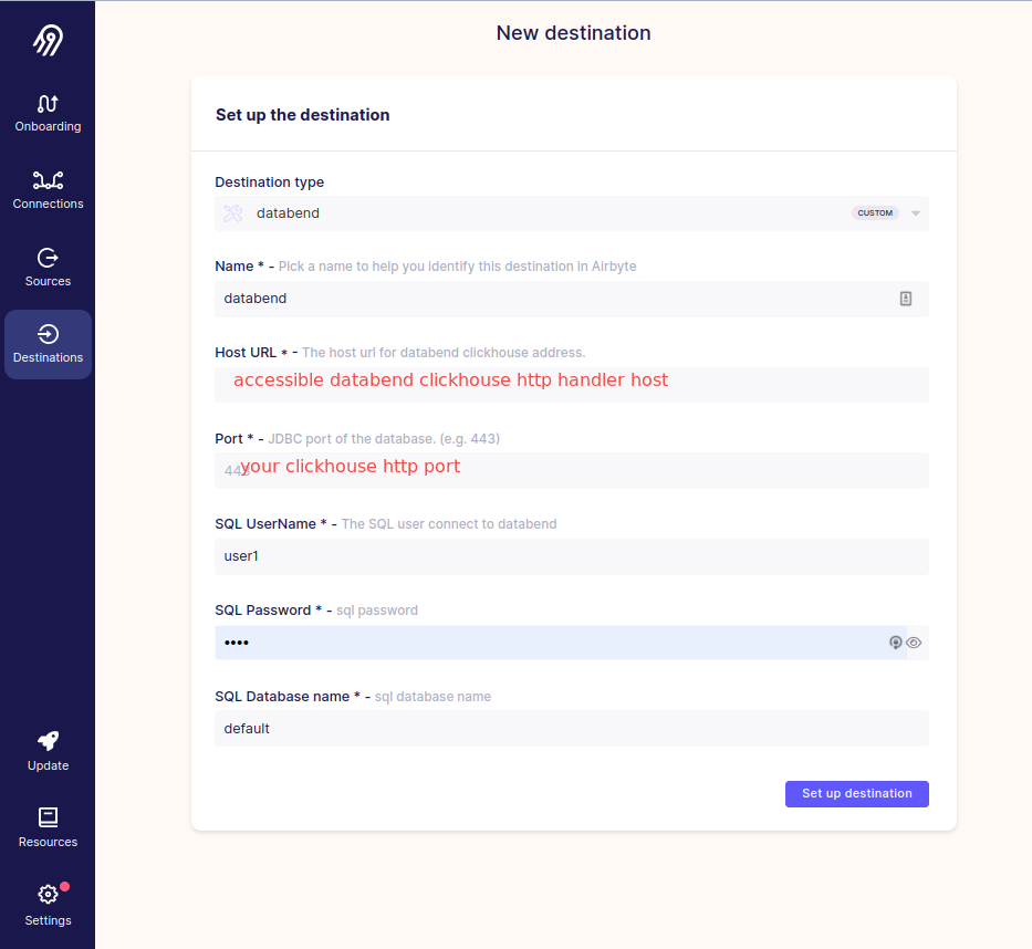 Our custom destination image is datafuselabs/destination-databend:alpha