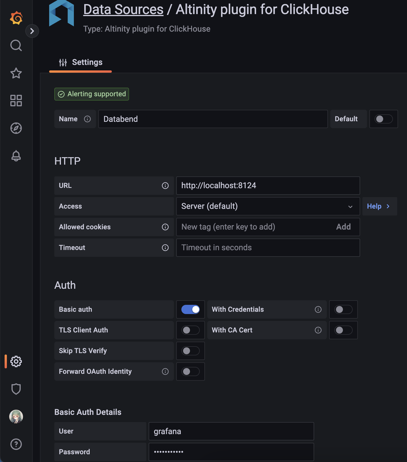 - Configure the datasource: - Necessary fields: - HTTP -> URLYour databend query clickhouse endpoint, for example:- http://localhost:8124